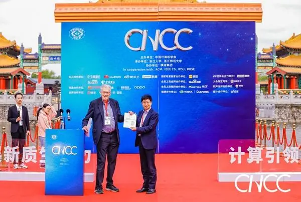 10月24日,在浙江横店举行的2024中国计算机大会(CNCC2024)上,图灵奖获得者、中国科学院外籍院士约翰·霍普克罗夫特(左)受邀作了大会报告。大会程序委员会主席、北京大学教授胡振江向其颁发感谢证书。