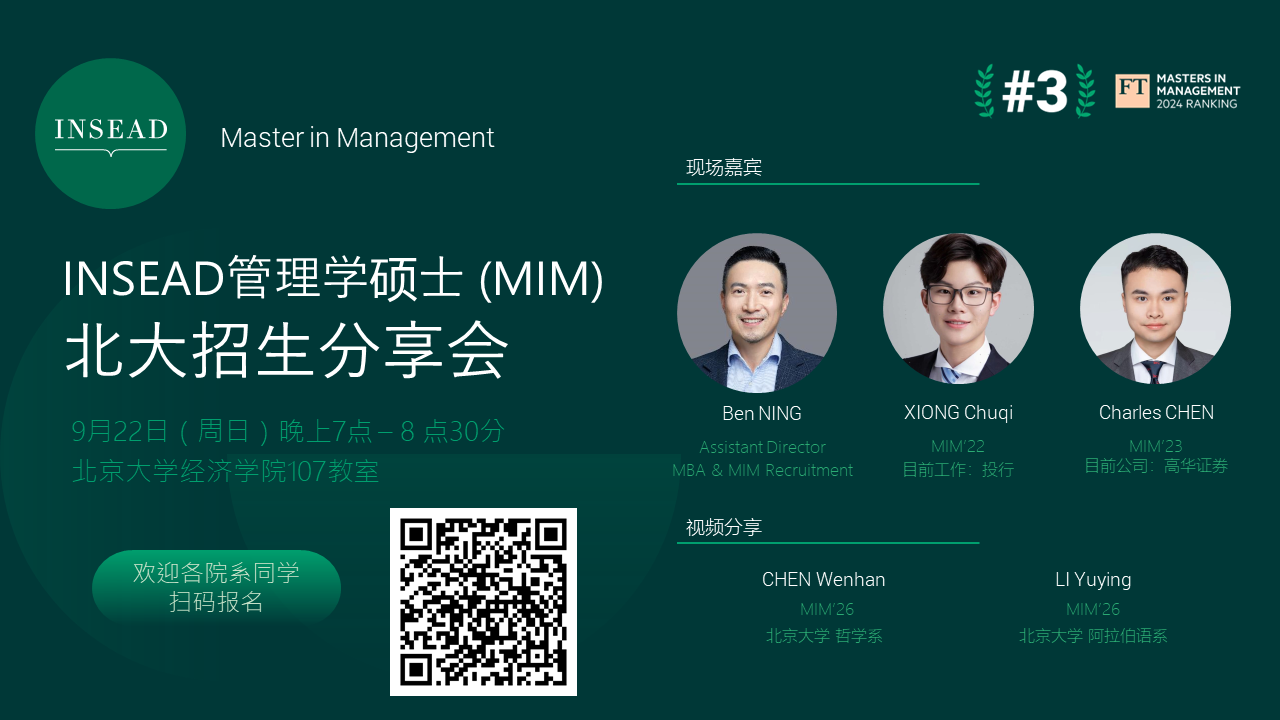 9月22日,INSEAD的全球招生官和MIM校友到北大与同学们分享MIM项目的学习体验、求职经验和申请要求。
