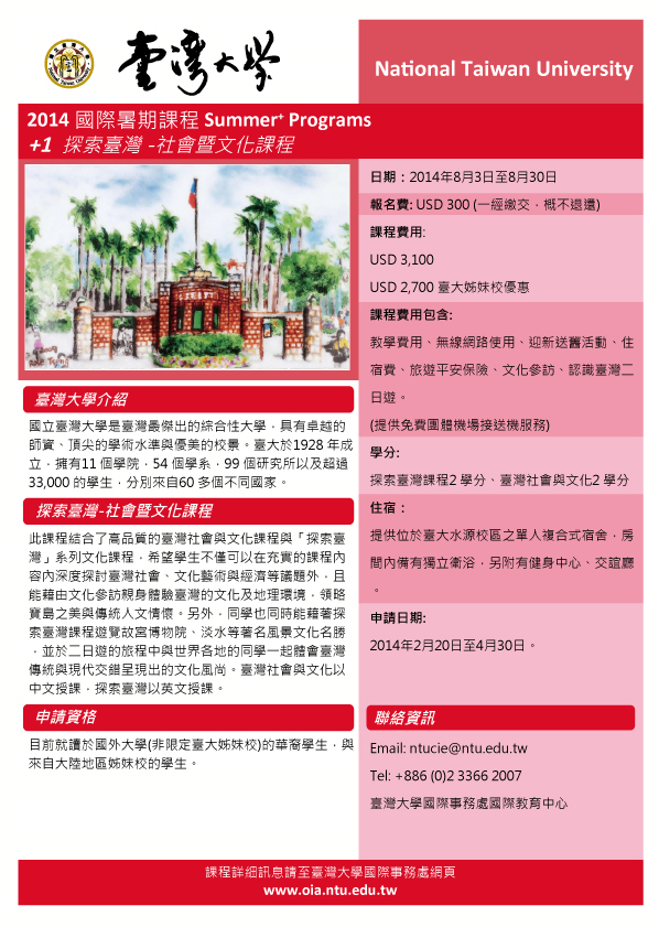 课程涵盖台湾社会与文化(中文授课)及探索台湾文化课程(英文授课)两部分,课程结束后提供台湾大学学分证明。