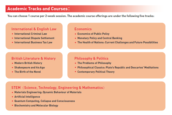 直播专业课程自主选—— 来自牛津大学奥利尔学院及其他学院的专业教师采用线上与线下同步直播形式授课,结合远程互动研讨,每期可从文理五大板块选1门课,每门课相当于6个欧洲学分ECTS(或3个美国学分US Credits);