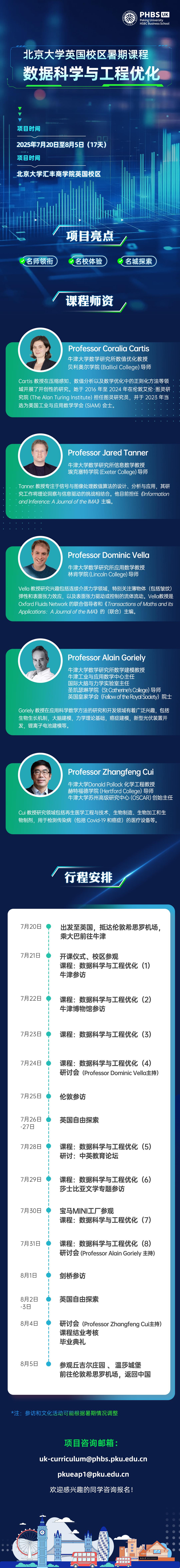 为提升学生在数据科学与优化技术领域的学术视野,北京大学教务长办公室、教务部、 国际合作部、汇丰商学院、工学院联合推出2025年暑期研学项目“数据科学与工程优化”,列入2025年北京大学暑期选修课程,计3学分。