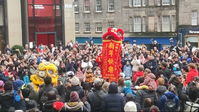 新年的时候正好在爱丁堡过。爱丁堡没有China town,但是当地有好多活动,包括舞龙舞狮、跳舞、中国和苏格兰交流音乐会等活动(舞龙舞狮的是外国人,不是中国人!),城堡还在晚上专门点亮了中国红。
