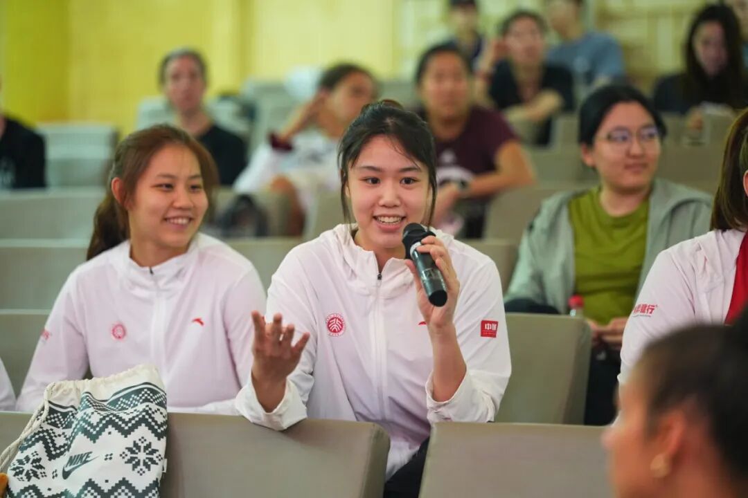 During the sharing session, players from both teams exchanged questions about their universities’ sporting cultures. Alexis Clark from the UChicago women’s basketball team asked about her Chinese counterparts’ backgrounds in basketball, such as when they began playing and how they managed to balance academics with athletics. In response, Cai Yuxin from Peking University’s women’s basketball team shared that many of her teammates had started playing from a young age. While academics is extremely important in China, she emphasized that basketball carries equal importance for the team. This dual commitment, she explained, drives the players to push themselves to the highest level to excel both on the court and in the classroom.