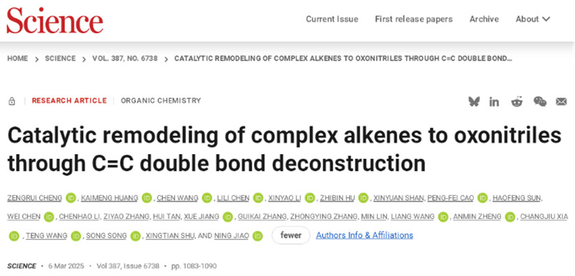 Whereas in Jiao’s study, titled “Catalytic remodeling of complex alkenes to oxonitriles through C=C double bond deconstruction”, a heterogeneous copper catalyst was successfully synthesized, achieving the transformation of complex alkene molecules to oxonitriles and enabling precise editing of the molecular skeletons of drugs, natural products, and other complex molecules. “This method is like a ‘molecular scalpel’ that selectively cuts C=C double bonds within molecules and achieve precise molecular skeleton editing," he explained. “This work fills an important piece in our research on the cleavage and transformation of carbon-carbon single bonds, double bonds, triple bonds, and aromatic ring bonds."
