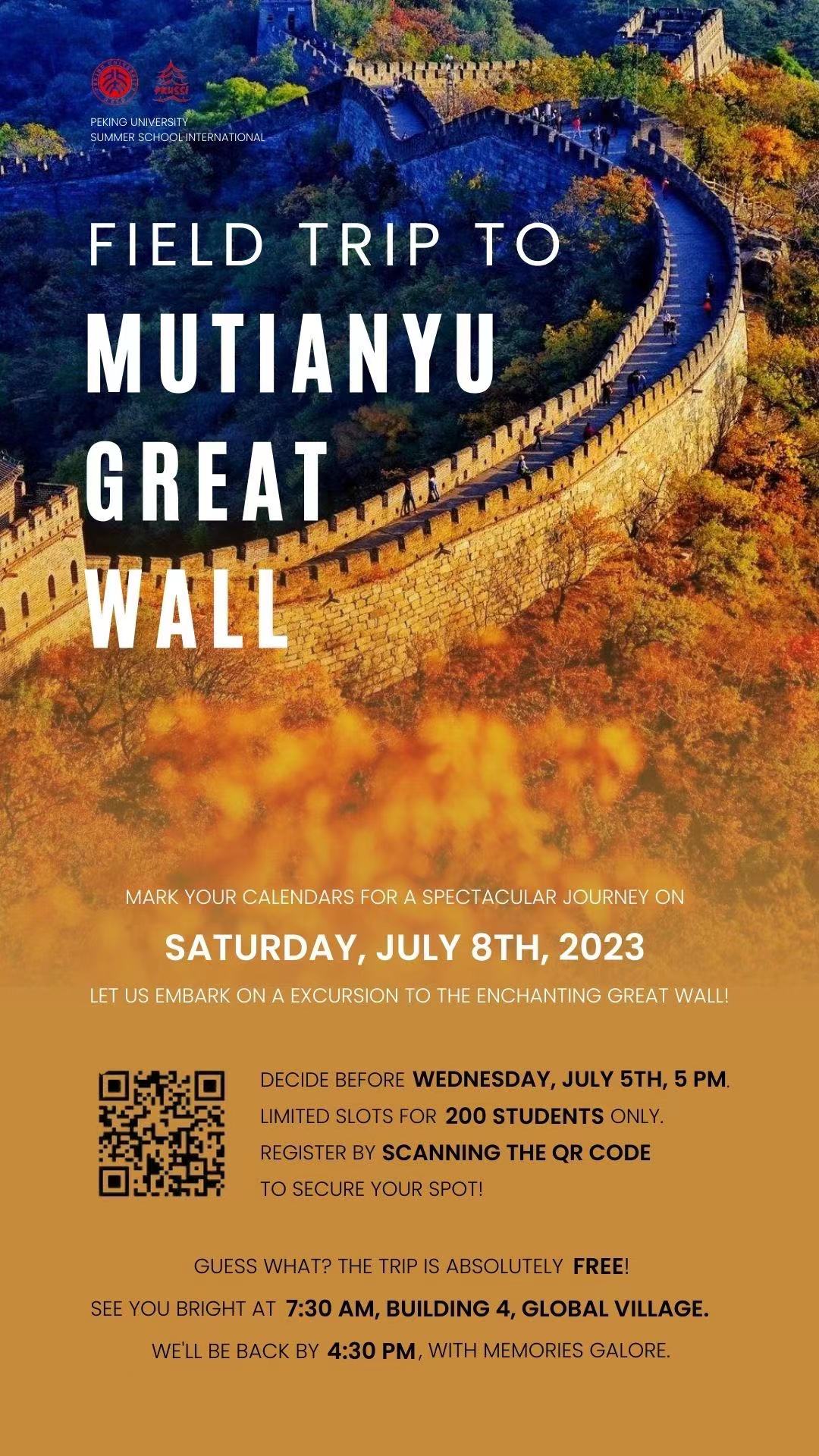 On Saturday (July 8th, 2023) we have planned a special trip to the Great Wall Mutianyu Section. We will meet you at 7:30 am in front of Building 4, Global Village and our coaches will leave at 7:40 am sharp. The trip may last a day and we will get back at around 4:30 o'clock.