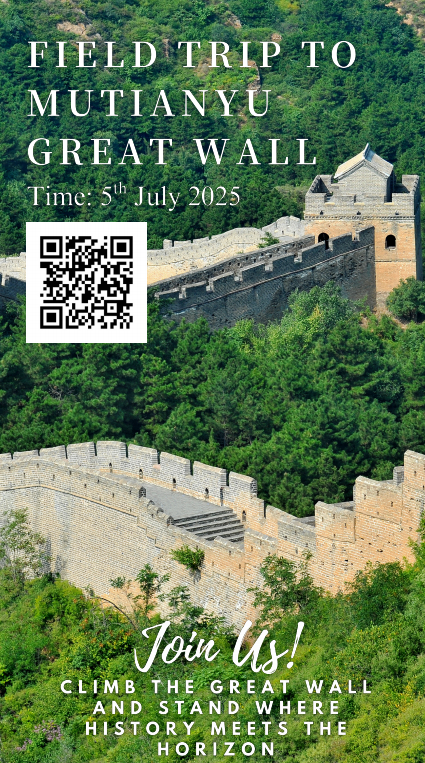 On Saturday, July 5th, 2025, we will have a trip to The Great Wall Mutianyu Section. We will meet at 8:00 A.M. in front of Building No.4, PKU Global Village. Our coaches will depart promptly at 8:10 A.M. The trip will last for the day, with an expected return around 4:30 P.M.