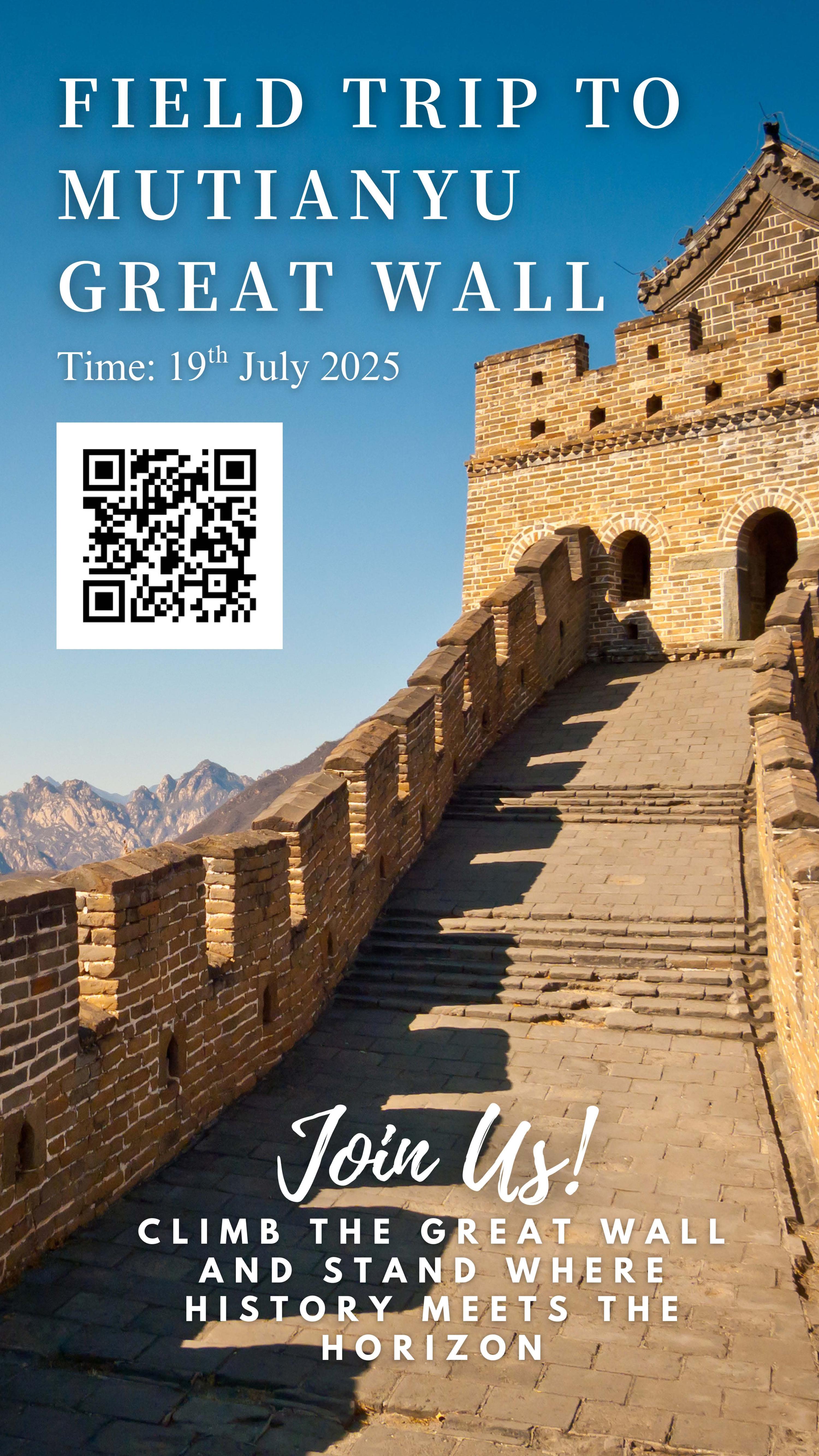 On Saturday, July 19th, 2025, we will have a trip to The Great Wall Mutianyu Section. We will meet at 8:00 A.M. in front of Building No.4, PKU Global Village. Our coaches will depart promptly at 8:10 A.M. The trip will last for the day, with an expected return around 4:30 P.M.